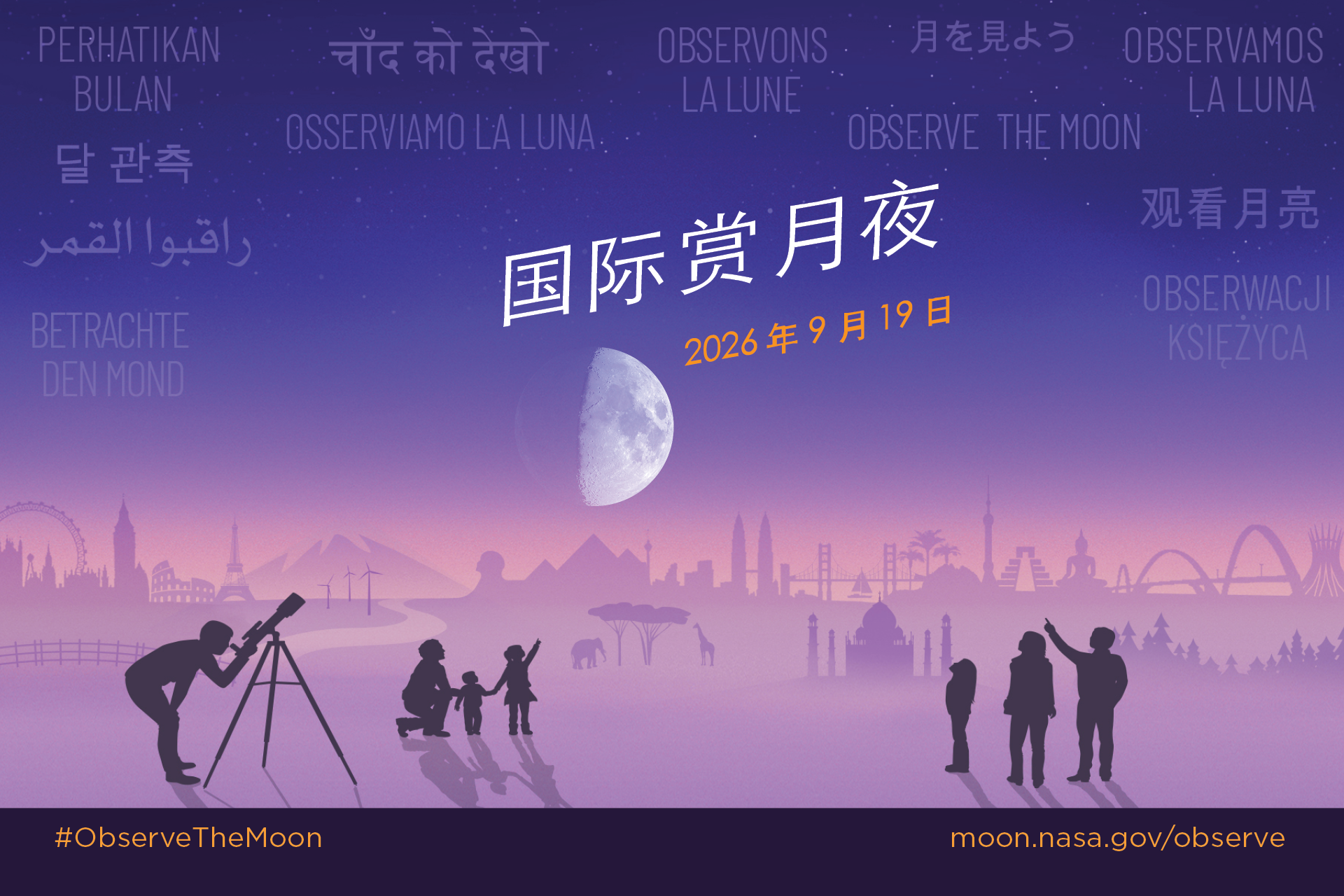 国际赏月夜 是一年一度的全球公众参与计划, 旨在鼓励 人们观察、欣赏和了解我们的月球及其与NASA行星 科学和探索的联系。我们邀请地球上的每个人都通过 举办或出席活动来参与庆祝。